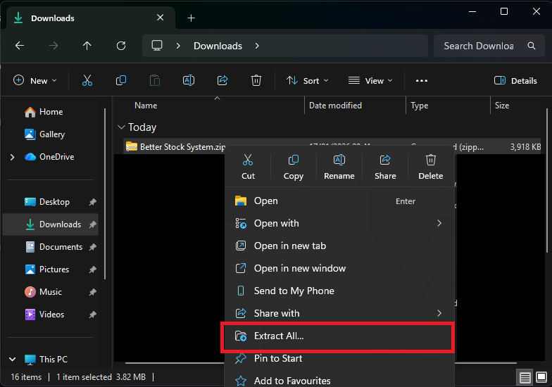 After the download is complete, right-click the downloaded file and select Extract All.