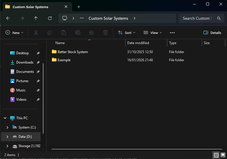 If the installation has been completed correctly, the Custom Solar Systems directory should appear similar to the example below.