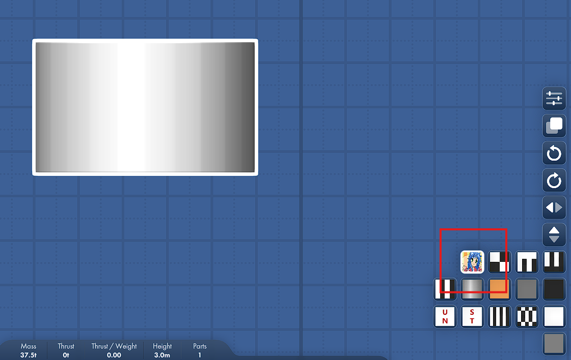 Also note that texture mods only apply to parts that use color textures. Parts that can't be textured include engines, struts, and landing legs, etc. If you apply a color texture to a part with a different resolution/size ratio, the texture may appear stretched or squashed.